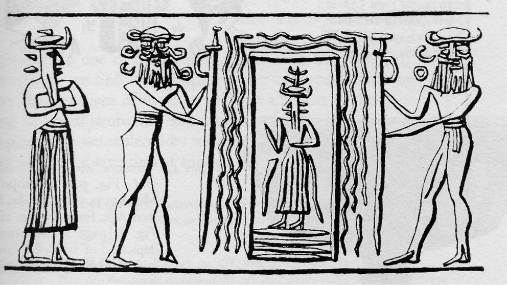 24. Akkadian cylinder seal impression showing the god Ea seated inside the Apsû as a rectangular enclosure.