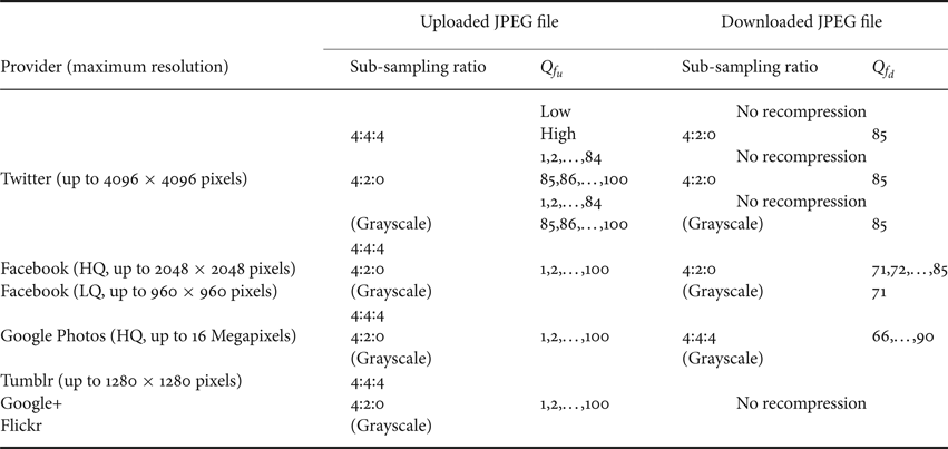 Table 2. Relationship between uploaded JPEG files and downloaded ones in terms of sub-sampling ratios and the maximum resolutions. Providers do not resize uploaded images when their resolutions are less than or equal to the maximum resolutions, e.g. the maximum resolutions of Twitter and Tumblr are 4096 × 4096 and 1280 × 1280, respectively [29].