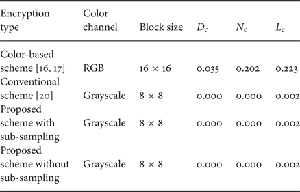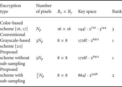 Table 5. Key space of the color-based, conventional, and proposed scheme (N p = 256 × 144)