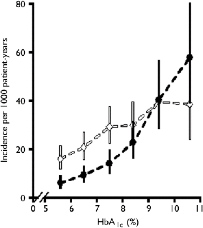 Fig. 1 Relationship between glycosylated haemoglobin (HbA1c) and microvascular disease (black line) and macrovascular complications (myocardial infarction, white line) in 4585 patients with type 2 diabetes (error bars, 95% CI). Reproduced from Stratton et al (Reference Stratton, Adler and Neil2000) BMJ, 321, 405–412 with permission from the BMJ Publishing Group.
