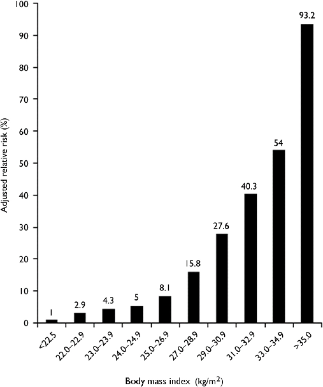 Environmental factors. The most important environmental risk factors for diabetes are obesity and physical inactivity. The massive explosion in obesity rates worldwide has largely been responsible for the increase in diabetes, and it is estimated that up to 80% of all new cases of diabetes can be attributed to obesity (Reference LeanLean, 2000). In the UK, the average body mass index (BMI) of a person with type 2 diabetes is 30.0 kg/m2 (Reference JonssonJonsson, 2002); in the USA, 67% of those with type 2 diabetes have a BMI of more than 27 kg/m2 and 46% have a BMI of more than 30 kg/m2 (National Task Force on the Prevention and Treatment of Obesity, 2000). The risk of developing type 2 diabetes increases across the normal range of BMI, such that the risk in a middle-aged woman whose BMI is over 35 kg/m2 is 93.2 times greater than in a woman whose BMI is below 22.5 kg/m2 (Fig. 2; Reference Colditz, Willett and RotnitzkyColditz et al, 1995).