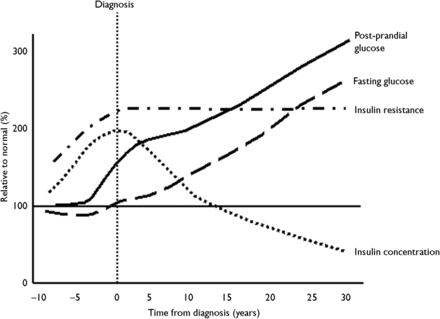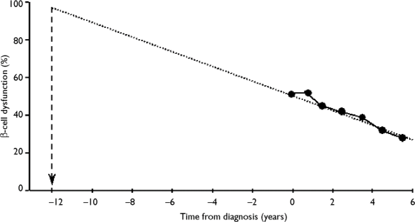 Extrapolation of the observed rate of β-cell decline suggests that the loss of β-cell function begins around 12 years prior to diagnosis (Reference HolmanHolman, 1998; Fig. 3). This progressive loss of β-cell function explains why patients require escalations in the number and dosage of oral hypoglycaemic agents with time, and why eventually they become refractory to the oral treatments and require insulin.