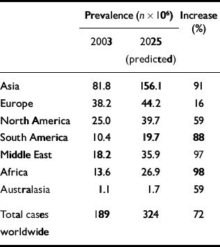 The prevalence of diabetes is increasing rapidly. The World Health Organization (2003) has predicted that by 2030 the number of adults with diabetes will have almost doubled worldwide, from 177 million in 2000 to 370 million. Using the WHO's data, Zimmet et al (Reference Zimmet, Shaw and Alberti2003) have compared current and predicted prevalence for certain regions for the years 2003 and 2025 (Table 2). A marked geographical variation in the prevalence of type 2 diabetes exists (Reference ZimmetZimmet, 1982). The highest rates are found in the Pima Native Americans of Arizona and in the inhabitants of the South Pacific island of Nauru, where approximately half the adult population have diabetes. In contrast, in the rural communities of China and Chile, the prevalence is less than 1%. In general, rates of type 2 diabetes are higher in urban populations than in rural communities (Reference ZimmetZimmet, 1982).