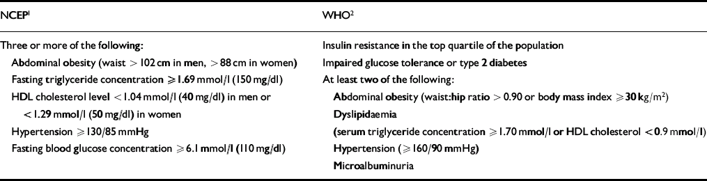 Table 3 Metabolic syndrome: National Cholesterol Education Program (NCEP) Adult Treatment Program III and World Health Organization (WHO) diagnostic criteria