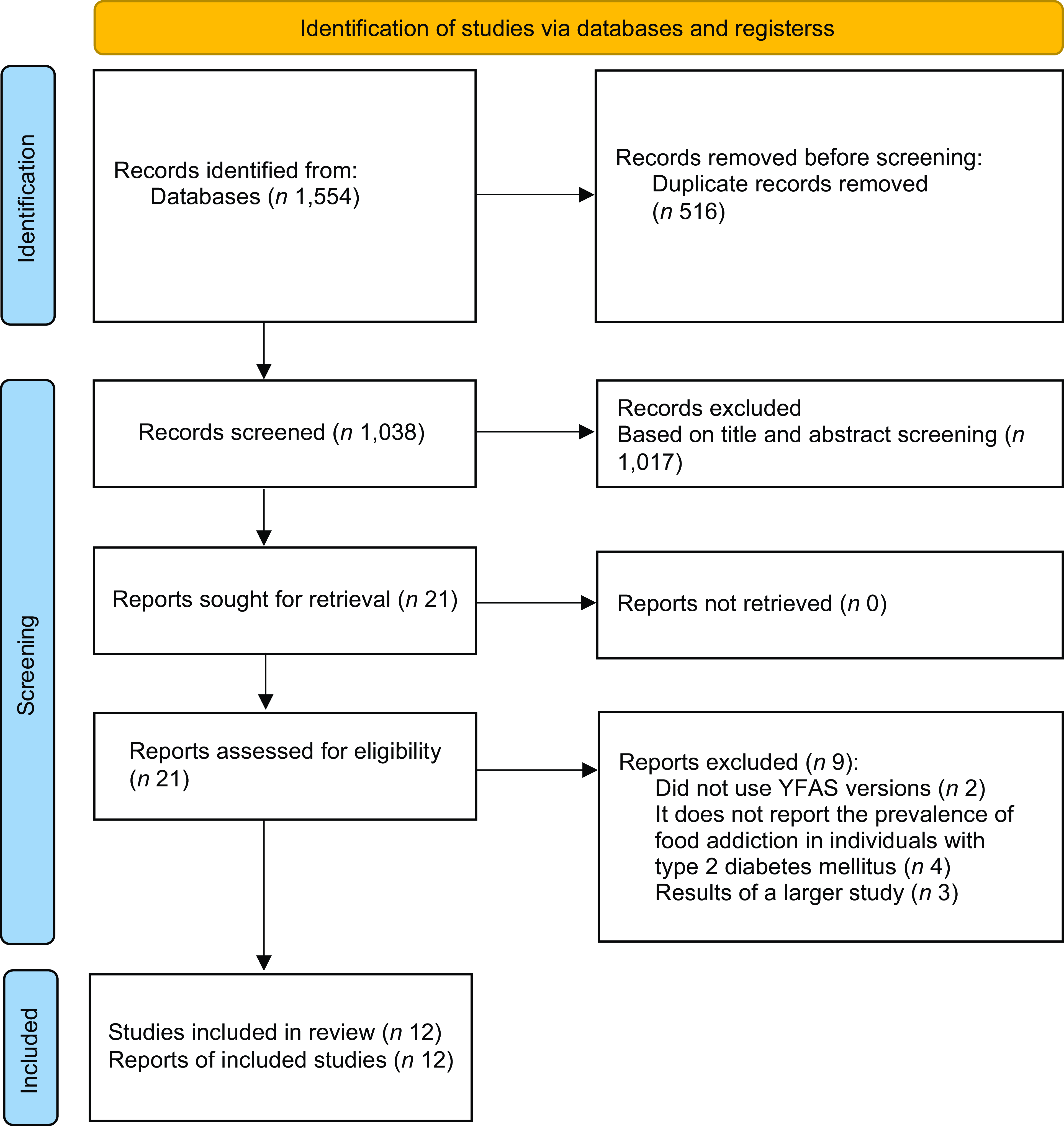A broad search strategy was constructed and included terms related to FA and type 2 diabetes, using MeSH terms and free terms. The research had no restrictions regarding the year or language of publication. As an example, the following strategy was used in the MEDLINE database: (((‘food addiction’) OR (‘eating addiction’) OR (‘Yale food addiction Scale’) OR (YFAS) OR (‘modified Yale food addiction scale’) OR (mYFAS) OR (‘Yale food addiction Scale 2·0’) OR (‘YFAS 2·0’) OR (‘modified Yale food addiction scale 2·0’) OR (‘mYFAS 2·0’)) AND ((diabetes) OR (‘diabetes mellitus’) OR (‘type 2 diabetes mellitus’) OR (‘Type 2 Diabetes’) OR (DM) OR (DM2) OR (‘Noninsulin Dependent Diabetes Mellitus’) OR (‘Noninsulin-Dependent Diabetes Mellitus’))).