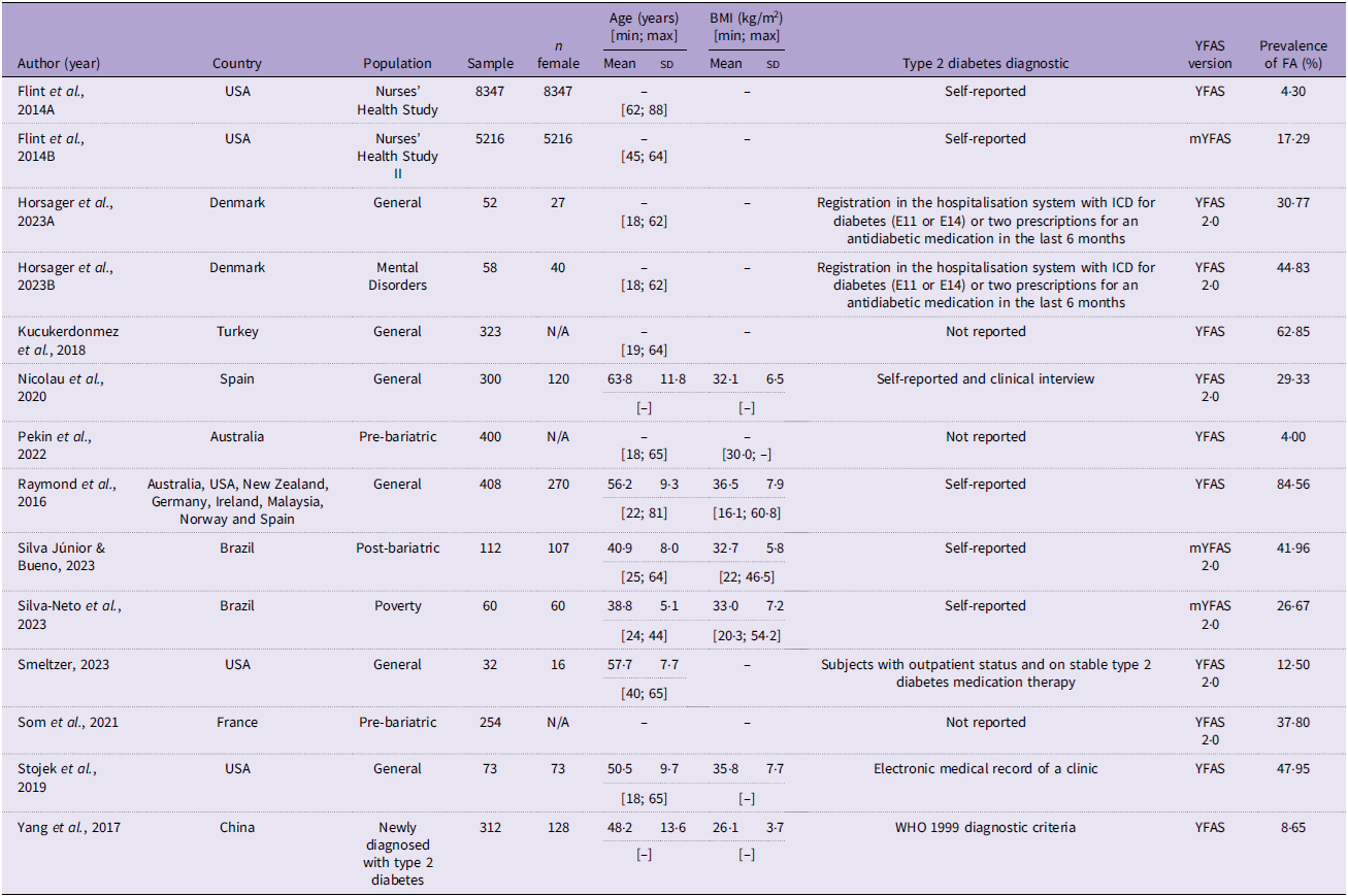 The studies by Raymond et al. (Reference Raymond, Kannis-Dymand and Lovell32) and Kucukerdonmez et al. (Reference Kucukerdonmez, Seckiner and Meseri29) had the highest prevalence of FA in individuals with type 2 diabetes (84·56 and 62·85 %, respectively). In contrast, Pekin et al. (Reference Pekin, McHale and Seymour31) presented a prevalence of 4·00 % of FA in individuals with type 2 diabetes before bariatric surgery, similar to the study conducted by Flint et al. (Reference Flint, Gearhardt and Corbin28) using the YFAS with data collected between 2008 and 2011, which showed a prevalence of 4·30 % of FA.