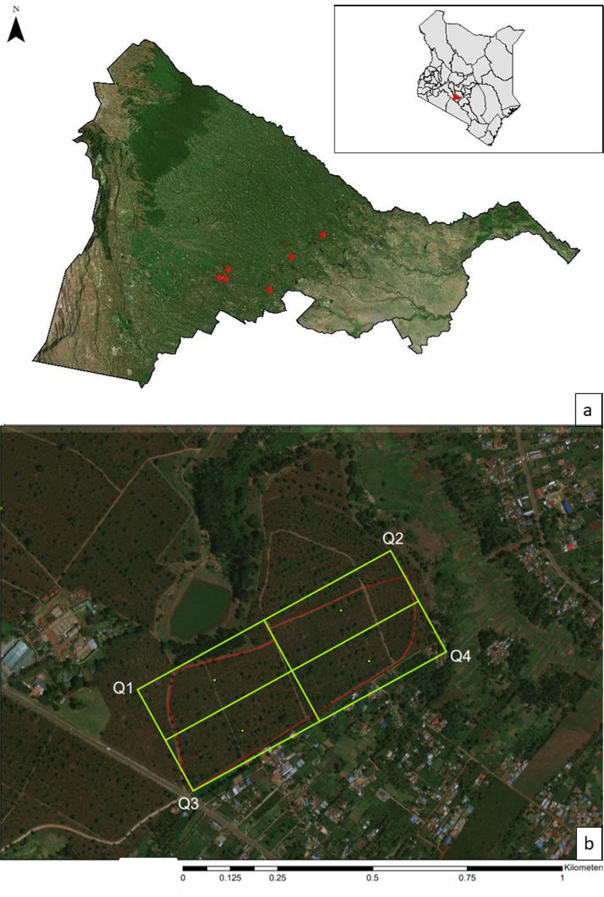 Figure 1. (a) Map depicting the spatial arrangement of the six farms surveyed in Kiambu County, Kenya from 16 December 2018–19 January 2019. (b) Site map depicting 4 quadrants overlaid on one of the coffee farms. Avian observation points were selected by going to the center of each quadrant (green dots) and from there selecting 3–4 points each with 3–4 trees between 23–40 cm diameter at breast height (dbh). All points were at least 50 m from the site edge (shown here in red) and within 20 m of each other