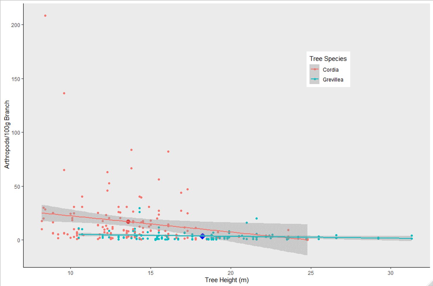 Figure 2. Arthropod density (arthropods per 100 g clipped and inspected vegetation) on Cordia and Grevillea trees on coffee farms in Kiambu County, Kenya, winter 2018-2019. Cordia had significantly higher arthropod density than Grevillea (P = 0.0002), and shorter trees had higher biomass regardless of tree species (P = 0.0167). Enlarged dots represent the mean arthropod density for each tree species and mean height.