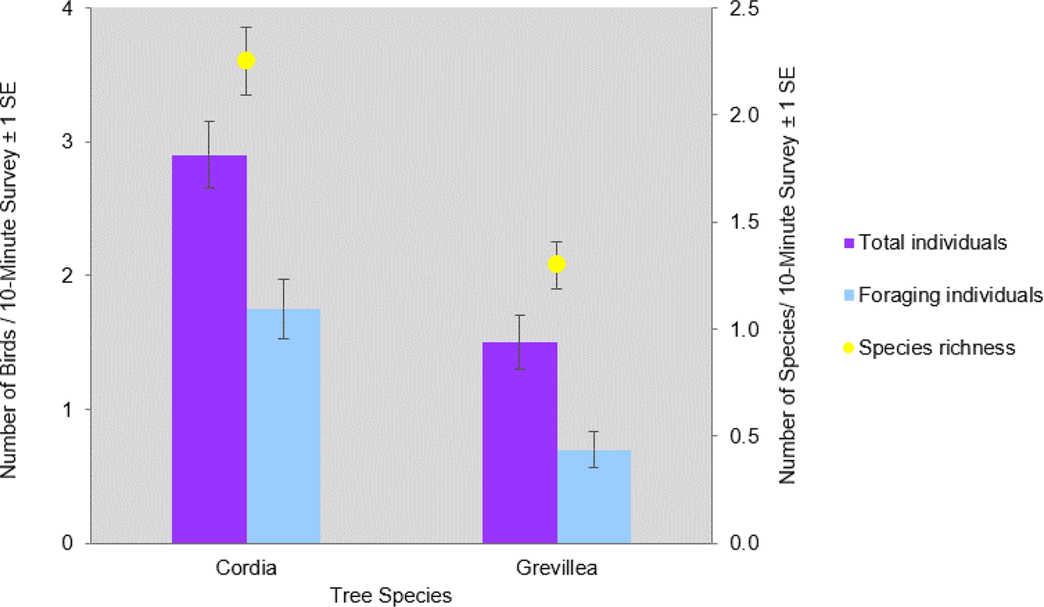Figure 3. Mean number (X̄ / 10-minute survey ±1 SE) of total individuals, foraging individuals, and bird species richness per 10-minute survey of Cordia and Grevillea shade trees on coffee farms in Kiambu County, Kenya, winter 2018-2019.