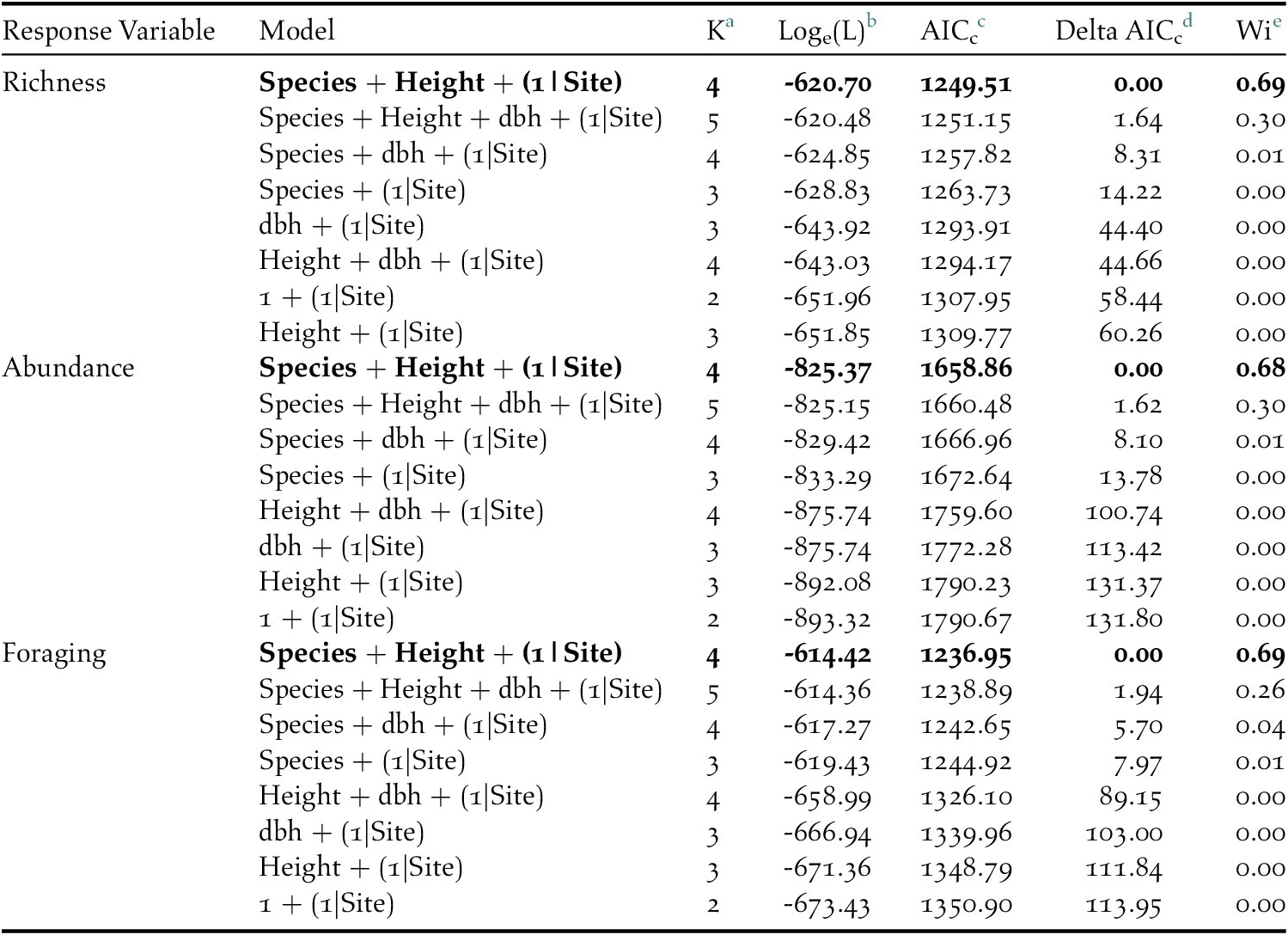 Table 3. AICc results of the competing general linear model set which included tree species, tree height, and diameter at breast height (dbh) as predictors to insectivorous bird species richness, abundance, and foraging on coffee farms in Kiambu County, Kenya, winter 2018-2019.