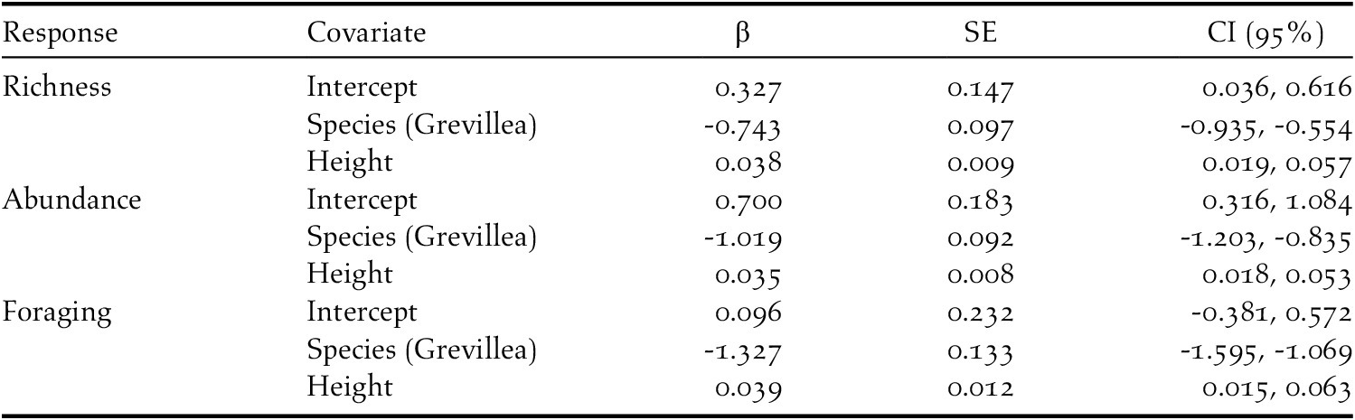 In total, 841 individuals of 19 insectivorous bird species were detected in the avian surveys: Batis molitor, Terpisphone viridis, Melaniparus albiventris, Sylvietta whytii, Apalis flavida, Phylloscopus trochilus, Ploceus baglafecht, two species of sylviid warblers (Family Sylviidae), two white-eyes (Family Zosteropidae), two Old World flycatchers (Family Muscicapidae), and six species of sunbirds (Family Nectariniidae; Table 2). Tree species and height were the top predictors of avian species richness, total abundance, and abundance of foraging individuals (Table 3). Grevillea was negatively associated with richness (β = -0.743 ± 0.097, 95% CI = -0.935, -0.554), total abundance (β = -1.019 ± 0.092, 95% CI = -1.203, -0.835), and foraging abundance (β = -1.327 ± 0.133, 95% CI = -1.595, -1.069). Tree height was positively associated with richness (β = 0.038 ± 0.009, 95% CI = 0.019, 0.057), total abundance (β = 0.035 ± 0.008, 95% CI = 0.018, 0.053), and foraging abundance (β = 0.039 ± 0.012, 95% CI = 0.015, 0.063; Table 4). Relative to Grevillea, a 10-min survey of Cordia trees on average contained +0.98 species, +1.61 total birds, and +1.1 foraging birds (Figure 3).