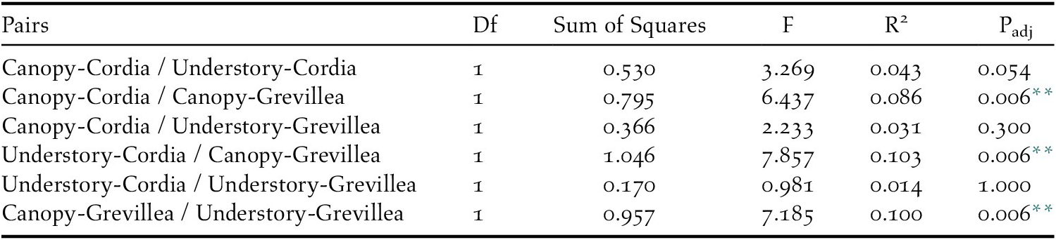 All 19 focal species were detected in the canopy of Cordia, 18 in the understorey of Cordia, 12 in the canopy of Grevillea, and 17 in the understorey of Grevillea, with 10 species detected in all four vegetation levels (Table 2). In the ordination, a stress level of 0.141 was obtained at convergence, indicating good ordination goodness-of-fit. The canopy community of Cordia was marginally more even than in Grevillea, and the understory community of Grevillea was the most even and most diverse of all four vegetation levels (Appendix S5). Pairwise PERMANOVA indicated that the bird community composition in the Grevillea canopy was significantly different from the Cordia canopy (r2 = 0.086, F = 6.437, padj = 0.006, df = 1), the Cordia understory (r2 = 0.103, F = 7.857, padj = 0.006, df = 1), and the Grevillea understory (r2 = 0.100, F = 7.185, padj = 0.006, df = 1). The community composition did not differ significantly between any other pair of vegetation layers (Table 5, Figure 4). Variance was also shown to be unequal between most groups (F = 21.596, P < 0.001, df = 3), with only Cordia understorey and Grevillea understorey communities having equal variance. However, pairwise PERMANOVAs are resilient to heterogeneity of variance in balanced designs such as this one (Anderson and Walsh Reference Anderson and Walsh2013), so the results of the pairwise PERMANOVA should not be a result of inequal variances.