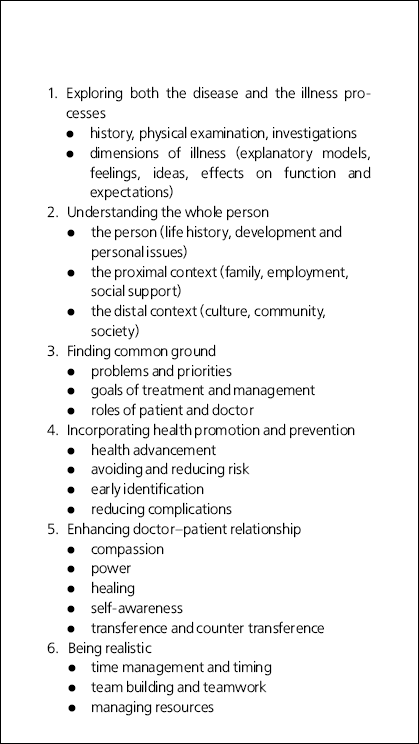 (Care) which explores the Patients’reasons for their visit, their concerns and need for information, seeks an integrated understanding of the patient's world i.e. their whole person, emotional needs and life issues and finds common ground on what the problem is and mutually agrees on management, enhances prevention and health promotion and enhances the continuing relationship between the patient and the doctor (Reference StewartStewart, 2001)