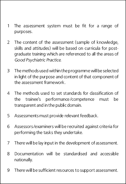 2. Towards Excellence in Assessment in Medicine: A Commitment To a Set of Guiding Principles (Reference DonaldsonDonaldson, 2004) sets out 15 principles along similar lines to the PMETB document, and the Royal College of Psychiatrists has indicated a commitment to adopting these.