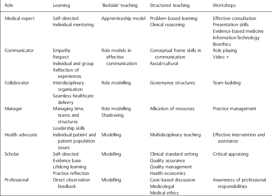 | Health advocate | Individual patient and patient population issues | Modelling | Multidisciplinary teaching | Effective intervention and assistance |