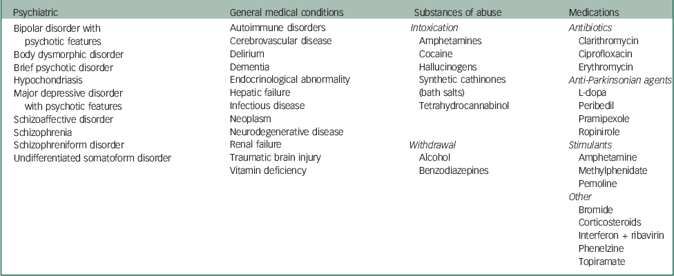 Delusional parasitosis that presents in isolation and cannot be explained by any other condition is referred to as primary delusional parasitosis, that is, delusional disorder somatic type. Secondary delusional parasitosis can result from: psychiatric disorders, general medical conditions, therapeutic or recreational substances or organic brain disease.Reference Freudenmann and Lepping 3 Other authors have detailed aetiologies of secondary delusional parasitosis (Table 2).Reference Lepping, Freudenmann, Huber, Bewley, Taylor, Reichenberg and Magid 2 , Reference Freudenmann and Lepping 3 , Reference Beach, Kroshinsky and Kontos 6 Freudenmann et al Reference Freudenmann and Lepping 3 indicated that the relative predominance of primary or secondary delusional parasitosis has not been established. Delusional parasitosis can be episodic or chronic, and the duration can vary from days to decades, with mean duration of approximately 3 years.Reference Freudenmann and Lepping 3 Primary delusional parasitosis tends to have a chronic course. Depending on the aetiology, secondary delusional parasitosis may have a chronic course, for example, if it is because of a chronic medical condition, or a very brief course, for example, if it is substance-induced.Reference Freudenmann and Lepping 3 Freudenmann et al Reference Freudenmann and Lepping 3 reported that cases of secondary delusional parasitosis associated with MDD-recurrent type with psychotic features are usually characterised by an episodic course with intermittent asymptomatic periods.