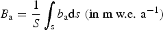 $$B_{\rm a} = \displaystyle{1 \over S}\vint_{\rm s} b_{\rm a} {\rm d}s\;({\hbox{in m w.e. a}}^{ - 1} ) $$
