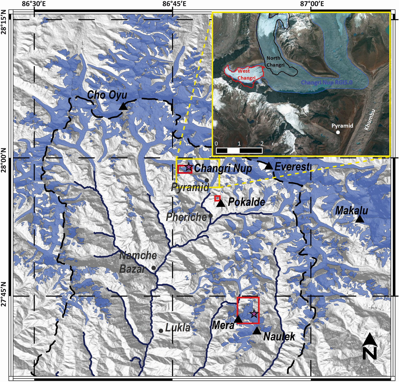 Fig. 1. Map of the Dudh Koshi basin, Khumbu area where Changri Nup, Pokalde and Mera Glaciers are located (inside the red squares). Pyramid meteorological station, major settlements and main summits are indicated by dots and triangles, respectively. Glacierized areas from the Randolph Glacier Inventory v5.0 (Pfeffer and others, Reference Pfeffer2014) are represented in blue. Dark blue lines represent river networks in the basin. Purple stars locate automatic weather stations on Changri Nup and Mera Glaciers. The inset shows the limits of debris-free west (red line) and debris-covered north (black line) Changri Nup Glaciers, which are two disconnected glaciers contrary to what is shown in the Randolph Glacier Inventory v5.0. (blue semitransparent area and blue outline).