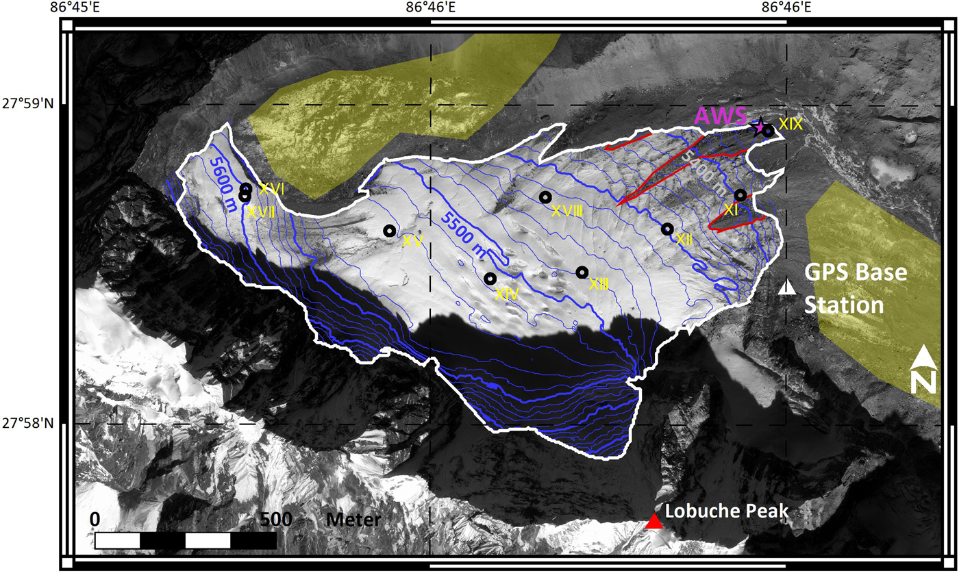 West Changri Nup Glacier (28.0°N; 86.8°E) is a small, partly avalanche-fed glacier located in the Khumbu valley, in the Sagarmatha National Park. This northeast-oriented glacier is disconnected from the neighboring debris-covered North Changri Nup Glacier (Fig. 1) and it has been monitored since 30 October 2010 (Fig. 2). Its area was 0.92 km2 in 2013, with an elevation range between 5330 and 5690 m a.s.l. From now on, in this study, West Changri Nup Glacier will be referred as Changri Nup Glacier.