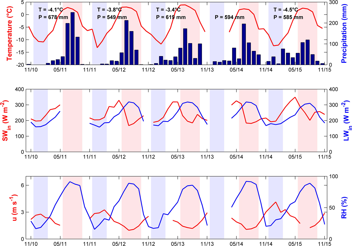 Fig. 3. Local meteorological conditions at the Changri Nup AWS (5360 m a.s.l.) except the precipitation at Pyramid (5035 m a.s.l.) from November 2010 to November 2015. SWin and LWin are shortwave and longwave radiation, respectively, u is wind speed and RH is relative humidity. Mild blue and pink-shaded areas represent winter and summer periods, respectively, and thus, areas that are not shaded represent post-monsoon and pre-monsoon. T and P stand for the annual (1 December to 30 November) mean air temperature and the cumulated precipitation recorded for 5 years from 2010 to 2015.