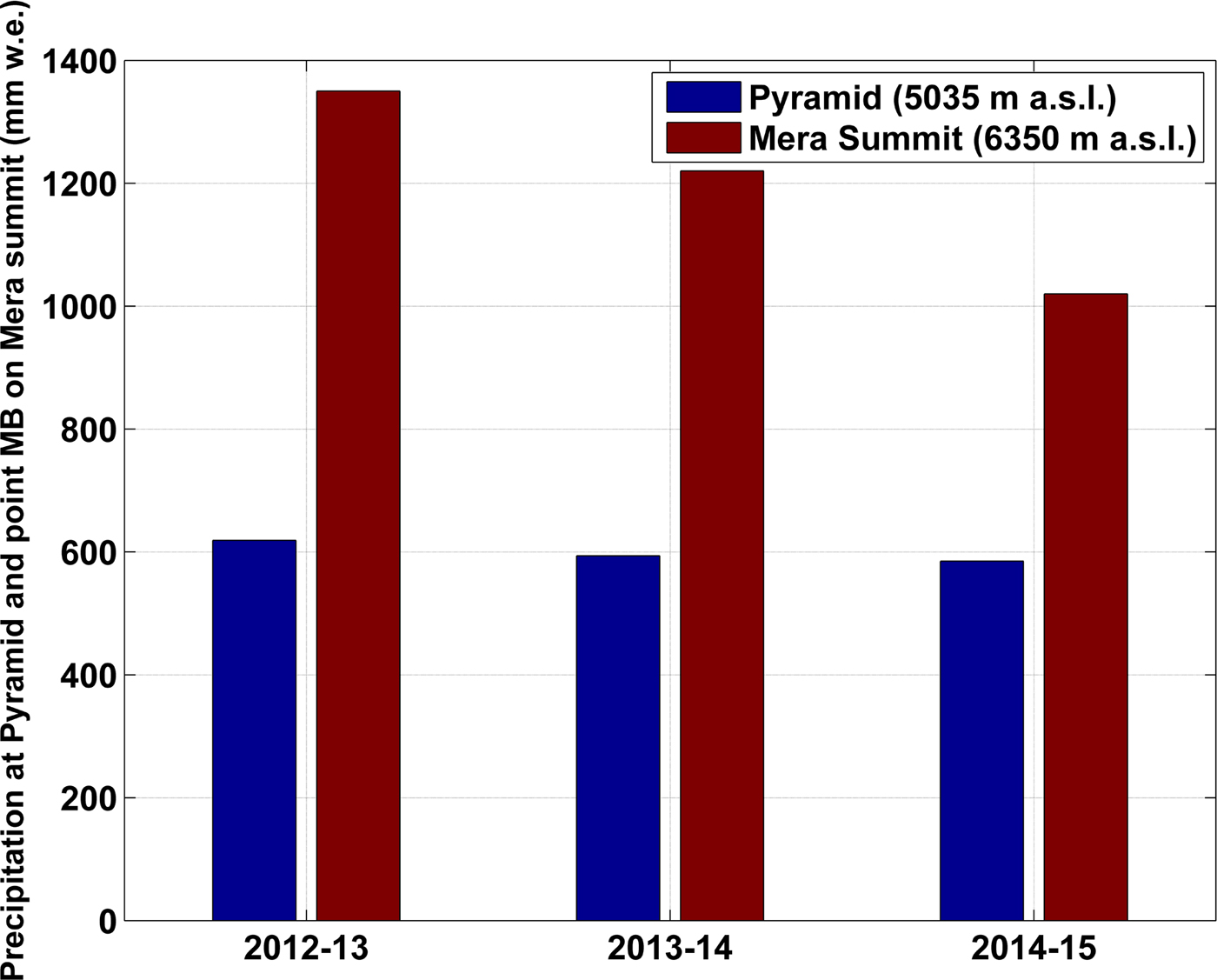 Fig. 4. Comparison between the annual precipitation (blue histograms) recorded at Pyramid (5035 m a.s.l.) and the lower limit of annual accumulation falling at 6350 m a.s.l. on Mera Glacier (red histograms) assessed as the maximum value between summer and annual point MB measured at this site. 2012/13, 2013/14 and 2014/15 correspond to measurements performed at Mera summit for the periods 21 April 2013–20 November 2013, 02 April 2014–10 December 2014 and 10 December 2014–09 December 2015, respectively.
