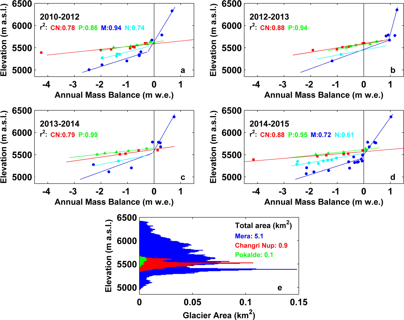 Fig. 5. First four panels: annual (2010–12, 2012/13, 2013/14 and 2014/15; (a–d), respectively) point MB (triangles, squares and dots) as a function of altitude on Pokalde (green), Changri Nup (red) and Mera (blue) glaciers. Dark and light blue correspond to measurements on Mera and Naulek branches of the Mera Glacier, respectively. The stakes were covered by snow and not visible on Pokalde and Changri Nup Glaciers in autumn 2011, and thus, the b a measured for 2010–12 was divided by 2 to obtain the annual mean for that period, and displayed in (a). The linear regression lines are also shown (red, green, dark blue and light blue lines for Changri Nup (CN), Pokalde (P), Mera (M) and Naulek (N), respectively) with their respective r 2 (over the ablation area), used to derive the annual glacier-wide mass-balance B a and mass-balance gradient over the ablation areas (note that in 2012/13 and 2013/14 on Mera and Naulek branches, the 2007–15 mean gradients are displayed because of a lack of visible stakes). These lines extend over the entire elevation range of each glacier. (e) Hypsometry of the three glaciers showing 10 m band areas.