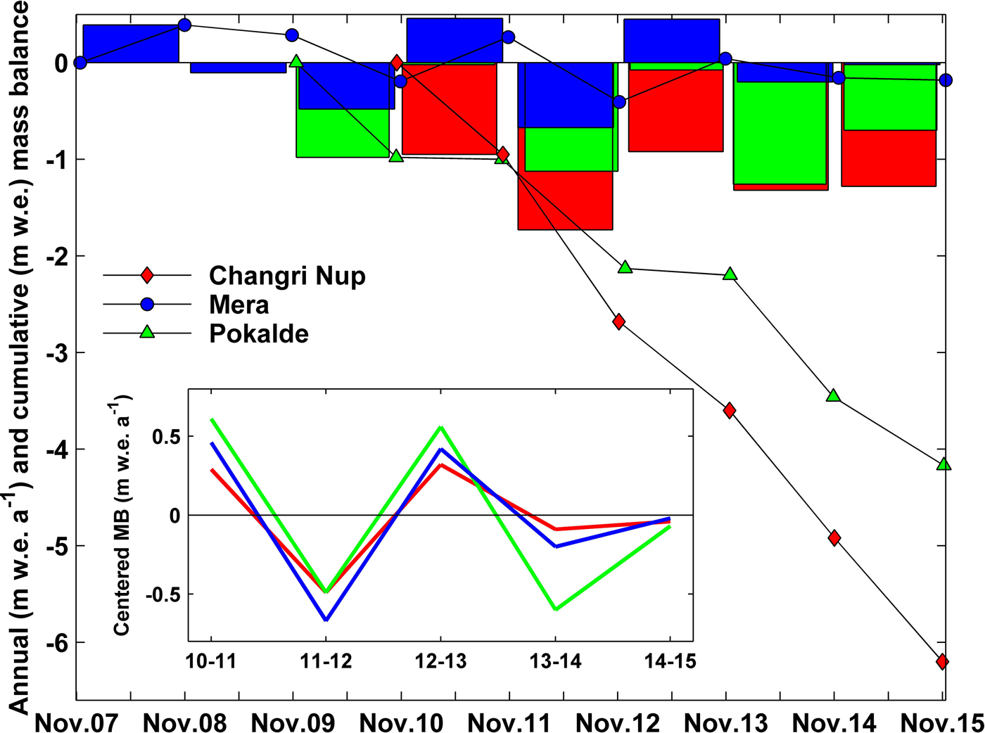 Fig. 6. Annual (histograms) and cumulative (line with dots) MBs of Mera (blue), Pokalde (green) and Changri Nup (red) glaciers, respectively. The inset shows the annual centered MB (i.e. annual B a – 2010–15 mean B a) for every glacier, over the period 2010–15.