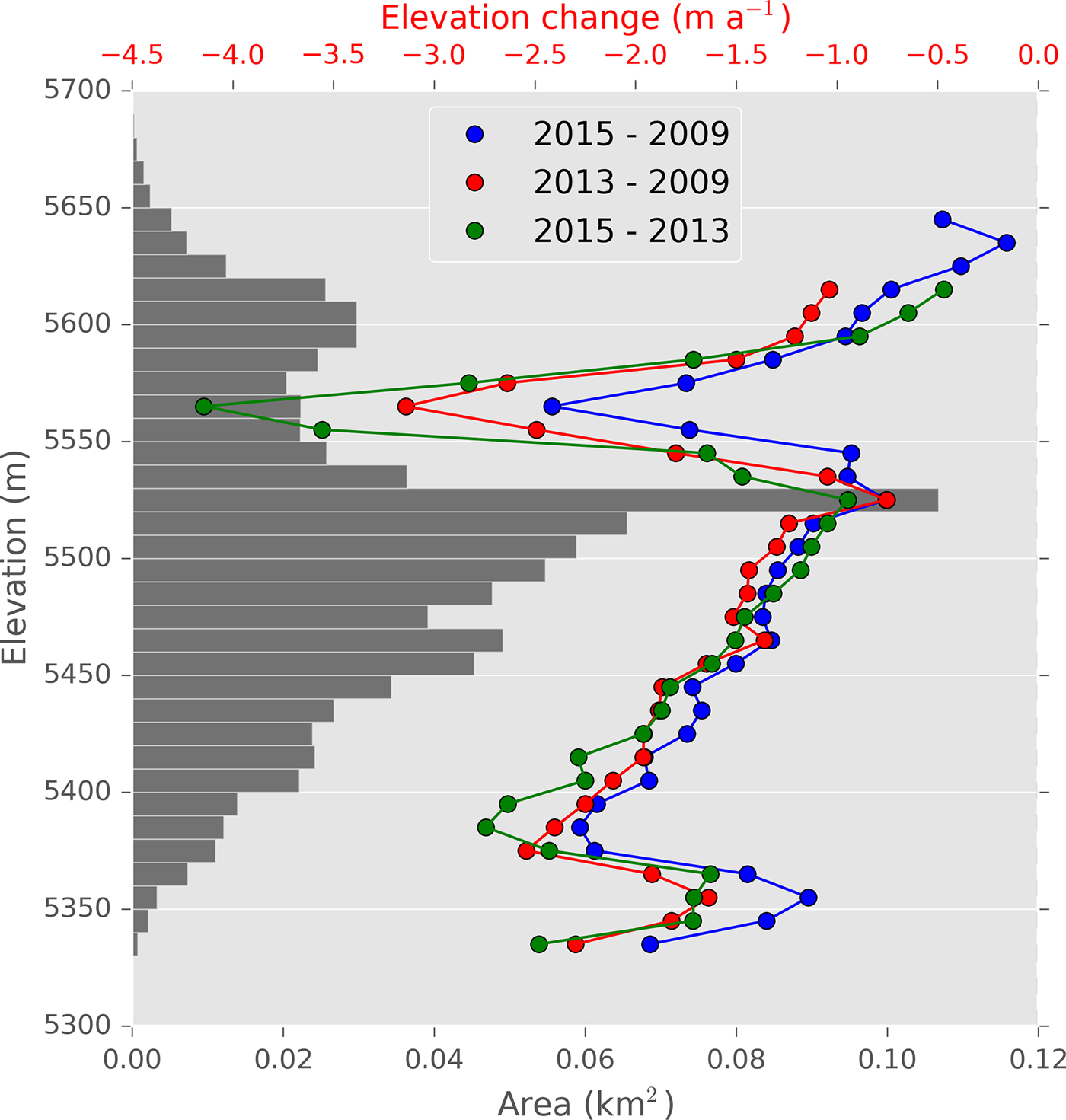 Fig. 7. Hypsometry and elevation change as a function of elevation of Changri Nup Glacier for the periods 2009–13, 2009–15 and 2013–15.