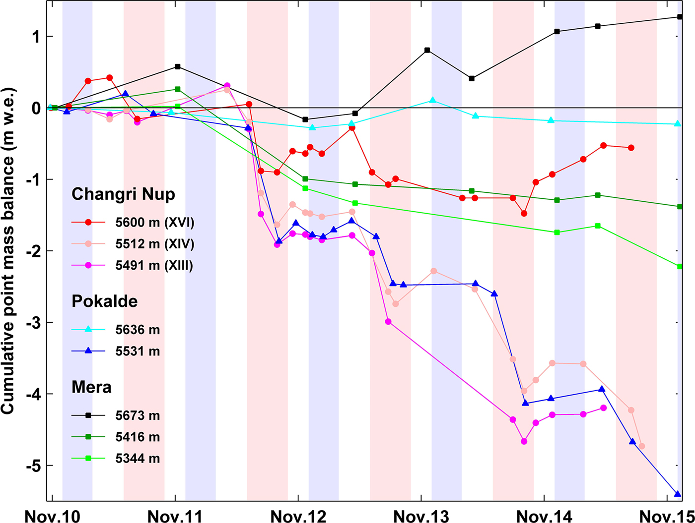 Fig. 8. Cumulative point MB recorded at different stakes on Changri Nup (lines with dots), Pokalde (lines with triangles) and Mera (lines with squares) glaciers between October 2010 and December 2015. In legend are the stake elevations and the names of the Changri Nup stakes (Fig. 2). Blue and pink-shaded areas highlight the winter (DJF) and summer seasons (JJAS), respectively.