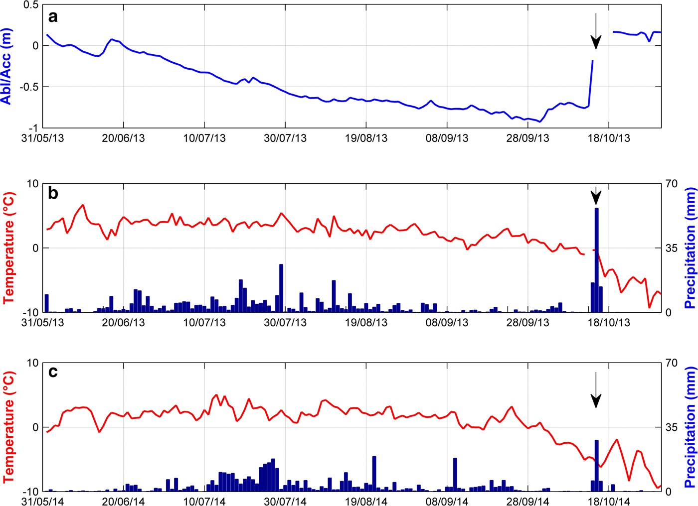 Fig. 9. (a) Daily cumulated snow accumulation (positive) or ablation (negative) in m of snow or ice measured at the Naulek AWS (5360 m a.s.l.) from 1 June to 31 October 2013 (record not available in 2014). (b, c) Daily air temperature (red line) at the Changri Nup AWS and precipitation at Pyramid (blue histograms) from 1 June to 31 October for 2013 and 2014, respectively. The arrows indicate typhoon Phailin (13–15 October 2013) and Hudhud (13–15 October 2014).