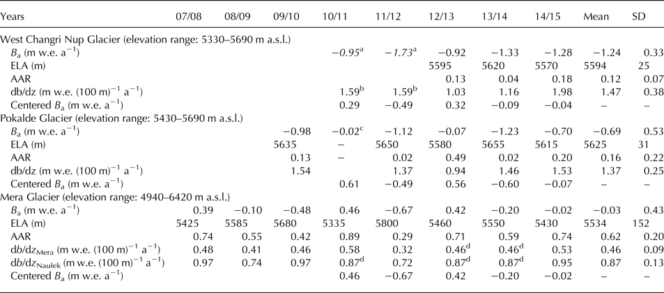 Table 3. B a, ELA, AAR and MB gradients db/dz for Mera, Pokalde and Changri Nup Glaciers