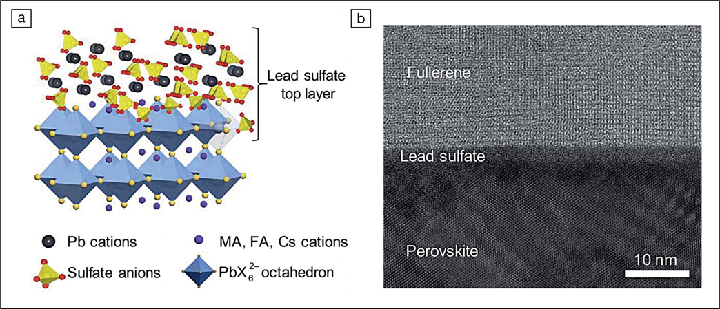 (a) Schematic illustration of protection of perovskites through in situ formation of a lead sulfate top layer on the perovskite surface. (b) Cross-sectional high-resolution transmission electron microscope image of the perovskite/lead sulfate/fullerene interface (fullerene is the charge-transport layer). Credit: Science.