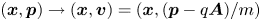 . The coordinate change $({\boldsymbol {x}},{\boldsymbol {p}})\to ({\boldsymbol {x}},{\boldsymbol {v}})=({\boldsymbol {x}},({\boldsymbol {p}}-q{\boldsymbol {A}})/m)$