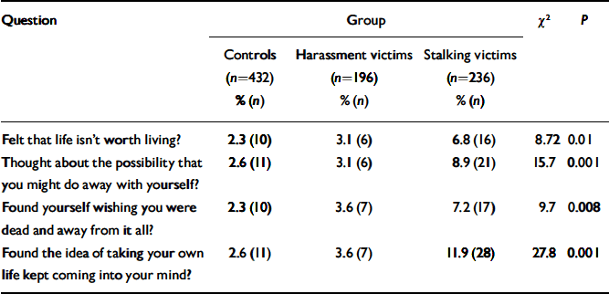 Victims of stalking notably had elevated scores on the index of severe depression. As high rates of suicidal ideation have previously been identified among stalking victims (Reference Pathé and MullenPathé & Mullen, 1997), the four GHQ–28 items assessing suicidality were examined (items 24, 25, 27 and 28). Victims of stalking were more likely than victims of short-lived harassment and controls to endorse recent suicidal ideation (Table 2).
