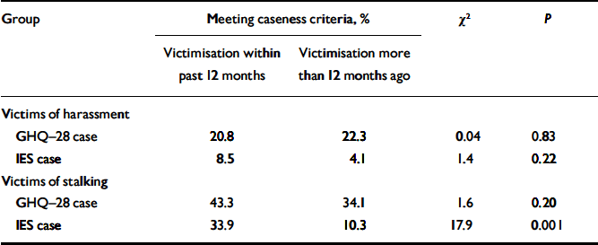 To examine whether victimisation is associated with acute or chronic disturbance, the proportion of victims meeting the criteria for caseness on the GHQ–28 and IES was compared between those victimised in the 12 months prior to the survey and those whose victimisation occurred before that time (Table 3). The rates of psychiatric morbidity among victims of harassment did not differ according to the recency of the victimisation. Among the victims of stalking, post-traumatic symptoms were higher among those victimised in the 12 months prior to the survey, although the rates of general psychopathology did not differ.