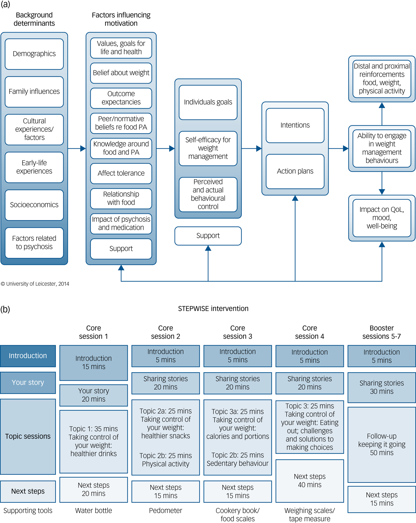 (a) Theoretical framework. The STEPWISE intervention was codesigned by a team with expertise in the development of obesity and lifestyle intervention programmes, mental healthcare professionals and researchers, and service users and refined during a four-cycle pilot. It was underpinned by self-regulation and self-efficacy theories and the relapse prevention model. (b). Curriculum. The STEPWISE intervention comprised four 2.5 h foundation group education sessions, designed to be delivered to small groups of 6–8 participants over 4 consecutive weeks followed by three 2.5 h follow-up ‘booster’ sessions at 3-monthly intervals and fortnightly support, usually by telephone. The content was determined by the specific difficulties described by people with schizophrenia. The sessions incorporated adequate breaks. The educational style was non-judgemental and facilitative to allow the participants to discuss their beliefs about weight and explore own solutions. Strategies was employed to maintain engagement including telephone call reminders, provision of taxis to the venue, afternoon sessions with lunch provided and use of incentives described as supporting tools. PA, physical activity; QoL, quality of life.