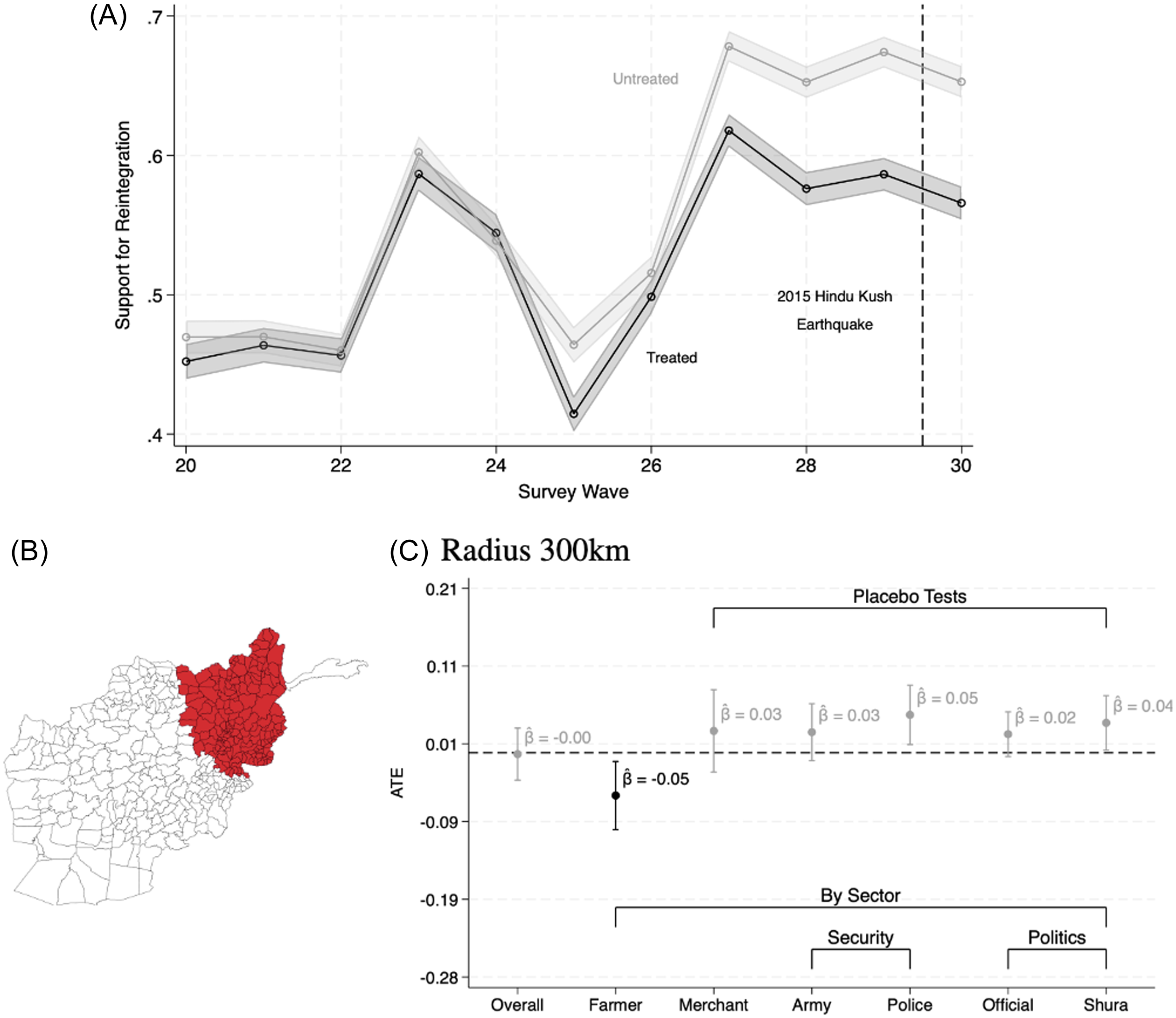 For this reason, we adopt a quasi-experimental approach, leveraging localized economic effects of the 2015 Hindu Kush earthquake, which devastated Afghanistan’s northeastern provinces and disproportionately impacted citizens engaged in the agricultural economy. We combine geocoded data on earthquake severity with individual-level survey responses measuring support for Taliban reintegration into a range of economic sectors. By comparing the causal effects of negative economic shocks on support for reintegration into a range of sectors—some affected, some not—we are able to distinguish the economic-competition mechanism from other mechanisms, including psychological channels or changes in the conflict environment itself.