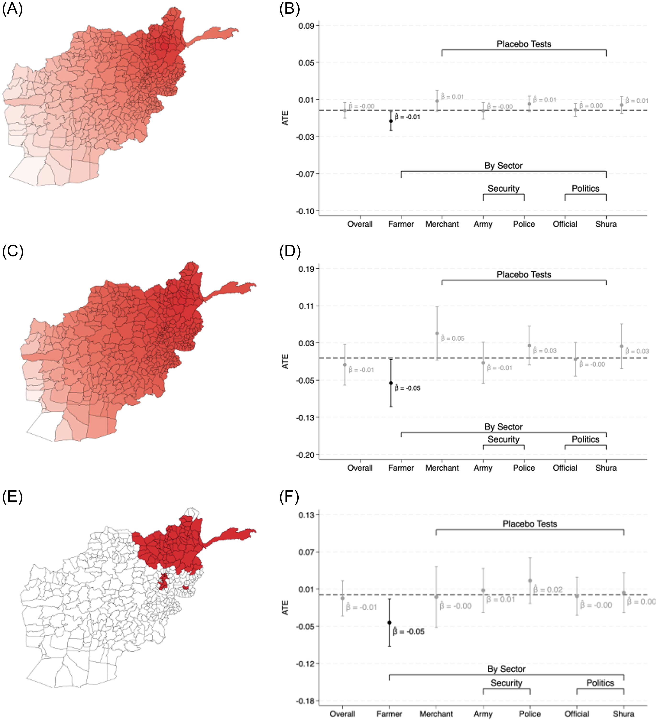 Statistical analysis supports our prediction that the earthquake reduced support for reintegration into adversely affected sectors. Using a difference-in-differences approach, we estimate a precise and substantively large negative impact of the earthquake on support for reintegration of Taliban fighters into agricultural occupations. Placebo tests indicate no change in support for reintegration into unaffected sectors of the economy. Shedding further light on the mechanism at work, we provide suggestive evidence that the reduction in support for reintegration to agricultural professions is strongest in the districts most reliant on cash crops and subsistence farming. We observe no impact of the earthquake on respondent perceptions of the security environment, suggesting our results are not driven by changes in patterns of combat or violence.