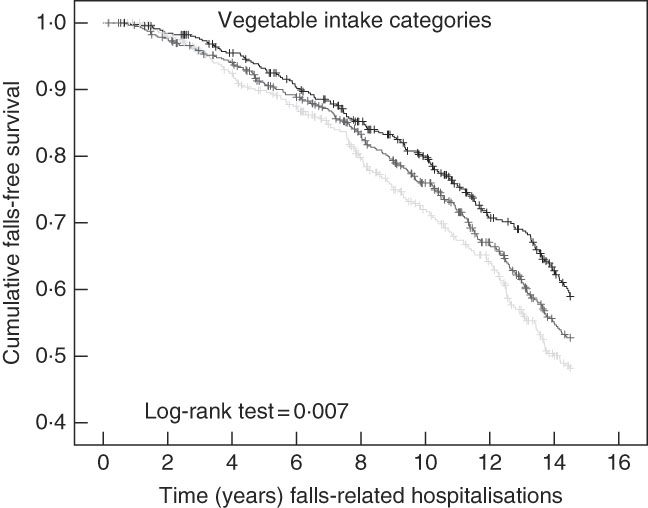 Fig. 1 Kaplan–Meier survival curve for vegetable intake categories on falls-related hospitalisations. Low: <2 serves/d, moderate: 2 to <3 serves/d and high: ≥3 serves/d intake categories are represented by the light grey, grey and black lines, respectively.