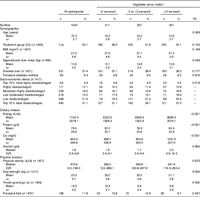 Participant baseline characteristics according to serves of vegetables per d are presented in Table 1. Daily total vegetable intake was 196·7 (sd 79·3) g, equating to 2·6 (sd 1·1) serves. Daily intake of the different vegetable types (in descending order of weight) were as follows: yellow/orange/red vegetables 51·8 (sd 27·5) g, cruciferous vegetables 32·1 (sd 21·9) g, legumes 27·5 (sd 18·6) g, leafy green vegetables 18·7 (sd 12·0) g and allium vegetables 7·8 (sd 6·8) g. Variables including energy, protein and Ca intake, as well as grip strength and TUG, were greater (or faster) (P<0·05) in high vegetable consumers (≥3 serves/d).