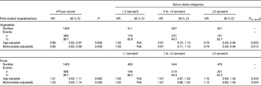 * HR (95 % CI) for falls-related hospitalisation by vegetable and fruit serve intake analysed using Cox proportional hazard models.
