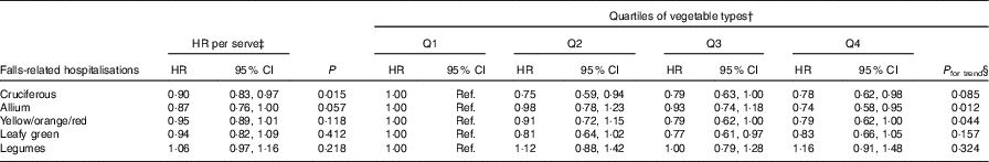 * Multivariable-adjusted HR (95 % CI) for falls-related hospitalisation by vegetable type analysed using Cox proportional hazard models, adjusted for age, BMI, treatment code, prevalent diabetes mellitus, socio-economic status, physical activity, smoking history and energy, protein, Ca and alcohol intake.