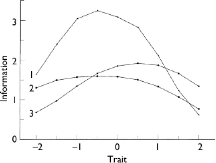 We estimated factor information functions to provide an estimate of the precision of measurement (Fig. 4). Factor 2 provided the most information across most of the latent trait; only at high trait levels (θ=1.0) did factor 1 provide more information. Factor 3 did not provide the most information at any point of the trait, despite the fact that it comprises more items than the other factors (five rather than four).