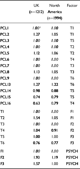 Table 1 Unstandardised loadings for hierarchical model for North America and UK (read as equation, e.g. PCL2=1.05T1 for North America, 1.27T1 for UK)