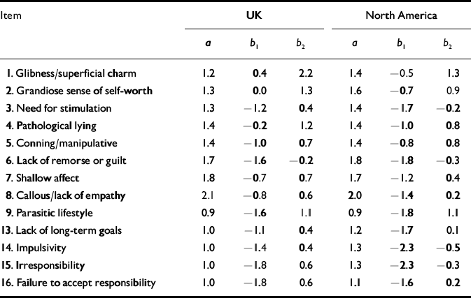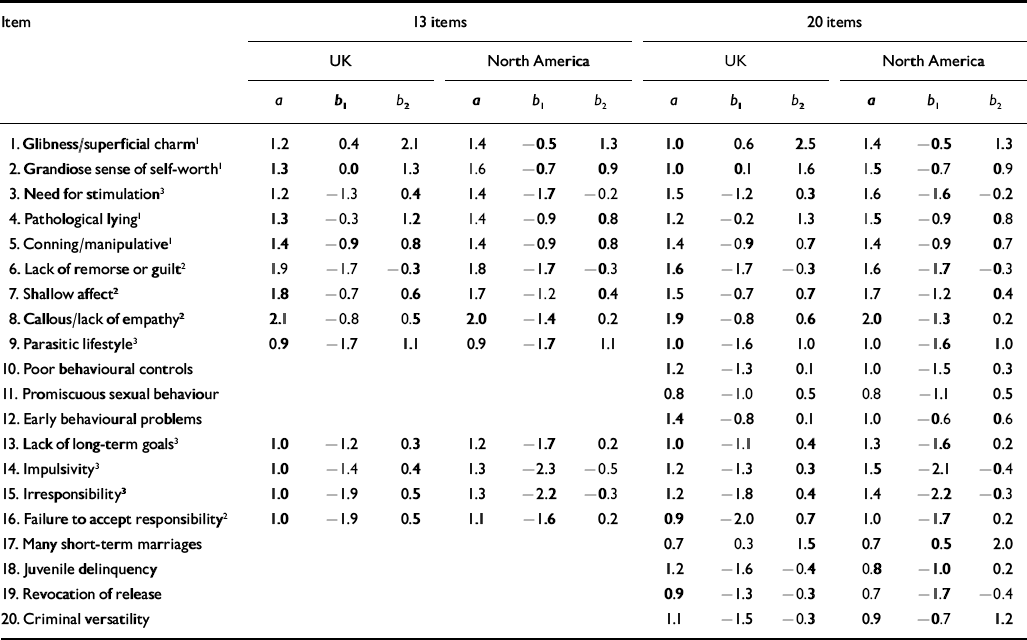 Finally, we replicated the previous analysis for all 20 PCL–R items across cultures using the same three anchors, i.e. items 5, 6 and 9. The results were unchanged: the corresponding parameters for items in both the 13-item and the 20-item solutions were essentially the same, with participants from the UK having lower ratings on most of the 20 PCL–R items than participants from North America, given equivalent standing on the latent trait (Table 3).