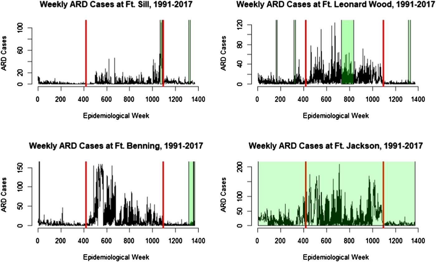 Fig. 1. Time series of ARD cases from 1991 to 2017 at Fort Sill (top left), Fort Leonard Wood (top right), Fort Benning (bottom left) and Fort Jackson (bottom right). The period between the red bars is the adenovirus vaccine shortage, with the time preceding the left bar representing the ‘old’ vaccine era, and the ‘new’ vaccine era to the right of the right bar. Green shading indicates BPG prophylaxis shortage. Fort Jackson never has used BPG for prophylaxis.