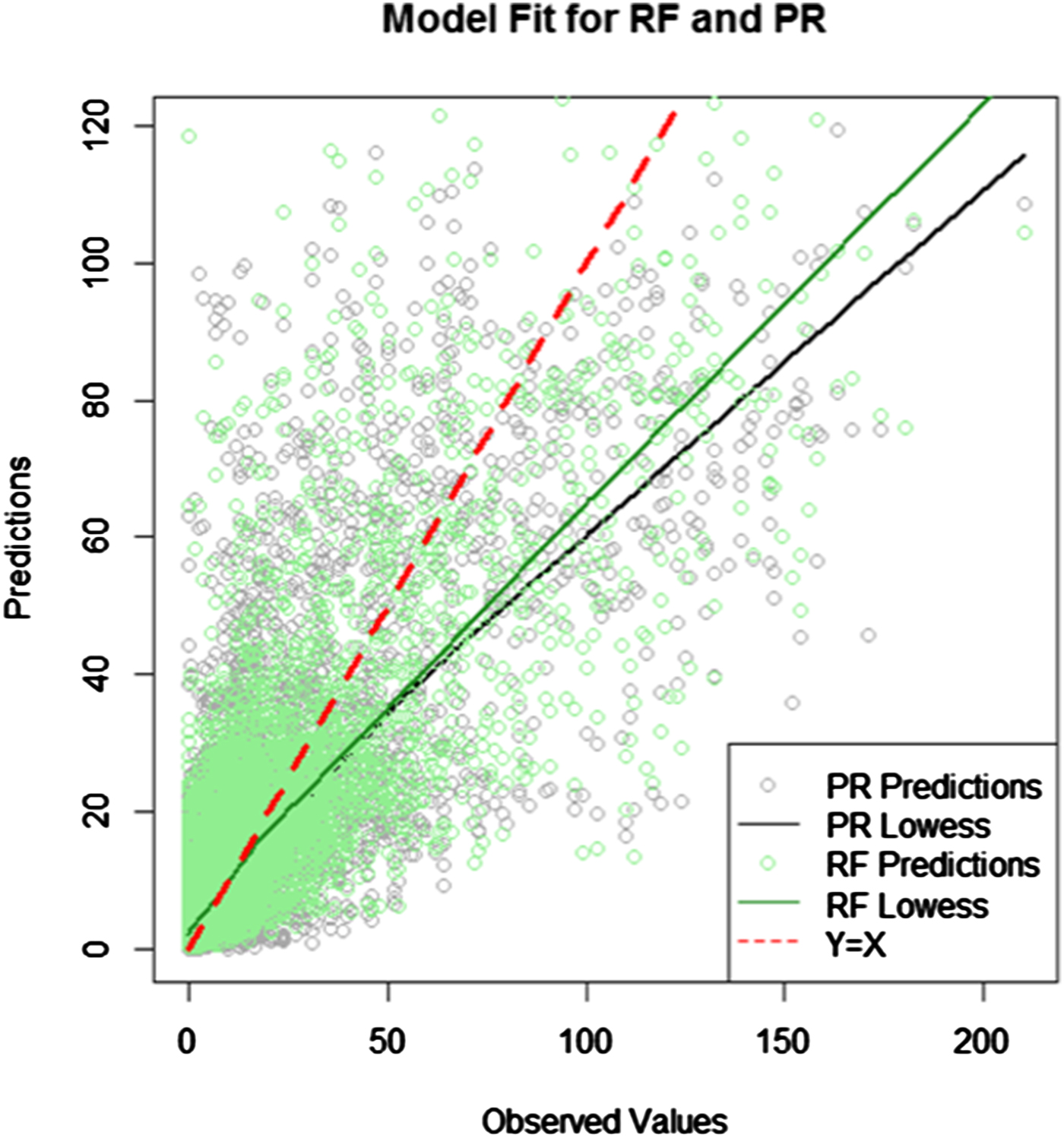 The RF model explained on average over 65% of the variance in the data, and outperformed the PR model k-fold cross-validation by 11.6% (Table 1). In the external validation, the RF model's predictive accuracy was over 20% superior to that of the PR model.