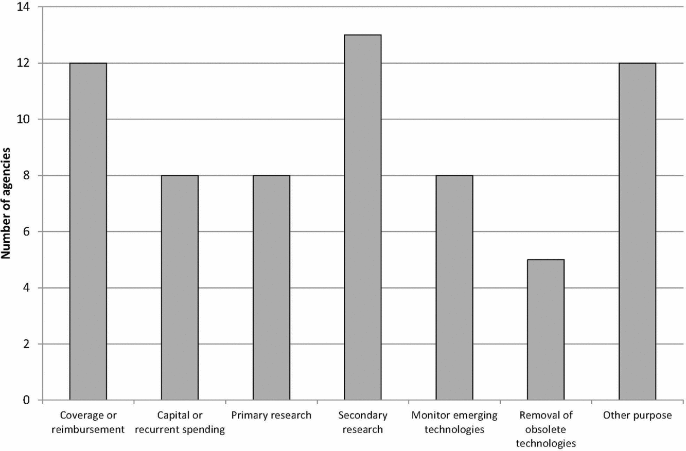Figure 1 shows the main reported purposes of the EAA systems. Over three quarters of the agencies considered their main purpose to be informing decisions on coverage or reimbursement of health services and informing decisions on undertaking secondary research, for example, health technology assessment and systematic reviews. Many of the other purposes related to decision making around the availability and adoption of new health technologies and to inform primary research, that is, the collection of original data for instance for clinical trials. Other purposes included identifying technologies with legal or ethical concerns, informing decisions about the development of clinical guidance, developing forecasting models for drug utilization and expenditure, and collaboration with international organizations involved in drug evaluation.