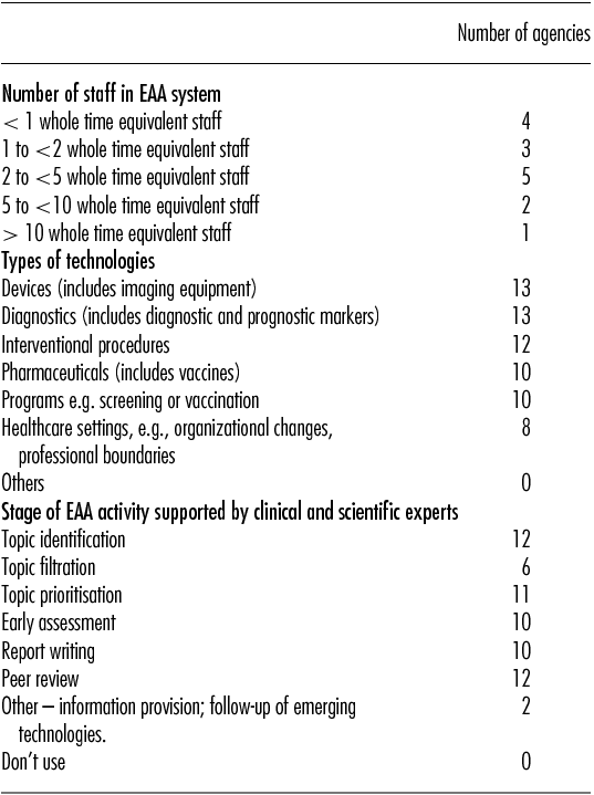 We found that the principal purposes of the EuroScan International Network member EAA systems are to inform decisions on coverage or reimbursement of health services and to inform decisions on undertaking secondary research. As expected given these purposes, the main users of information from the EAA systems were national governments and ministries; health professionals; health services purchasers, commissioners or other decision makers; and healthcare providers. Most of the EuroScan agencies were small with almost half, at the time of this survey, having fewer than two whole time equivalent staff.