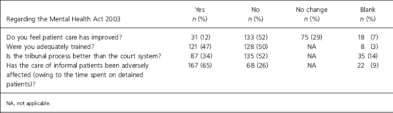 The results from the questionnaire regarding psychiatrists’ experience of the Act are shown in Table 1. When asked ‘Overall how satisfied are you’, only 3 respondents (1%) were very satisfied, 92 (36%) were reasonably satisfied, 112 (44%) were unsatisfied and 47 (18%) were very unsatisfied.